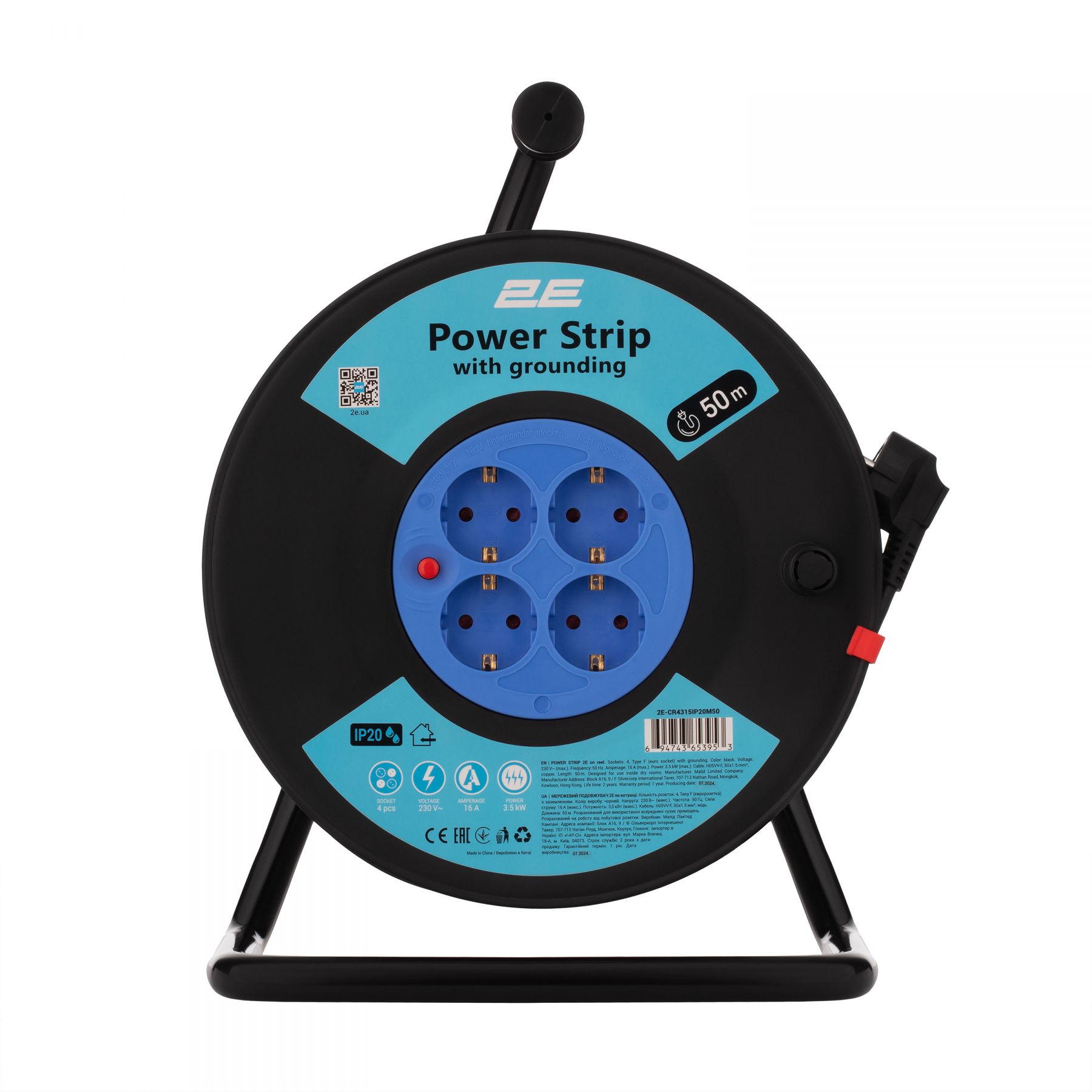 Подовжувач мережевий 2E 4хТип F, 3х1.5мм кв, 16A, на котушці, 50м, чорно-синій