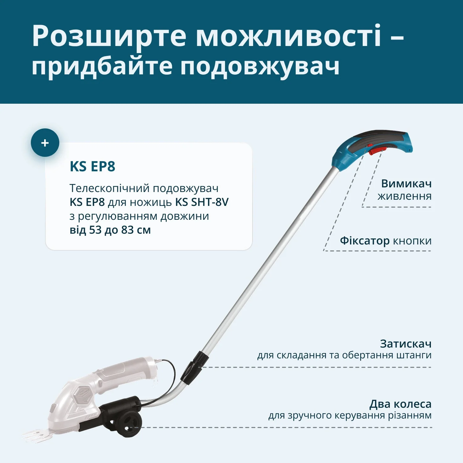 Телескопічний подовжувач для садових ножиць Konner & Sohnen® KS SHT-8V забезпечує зручну роботу без нахилів і точний контроль зрізу. Довжина регулюється від 53 до 83 см, колісна опора стабілізує хід, а швидкорознімний роз’єм живлення та ергономічні елементи керування забезпечують інтуїтивне користування.
