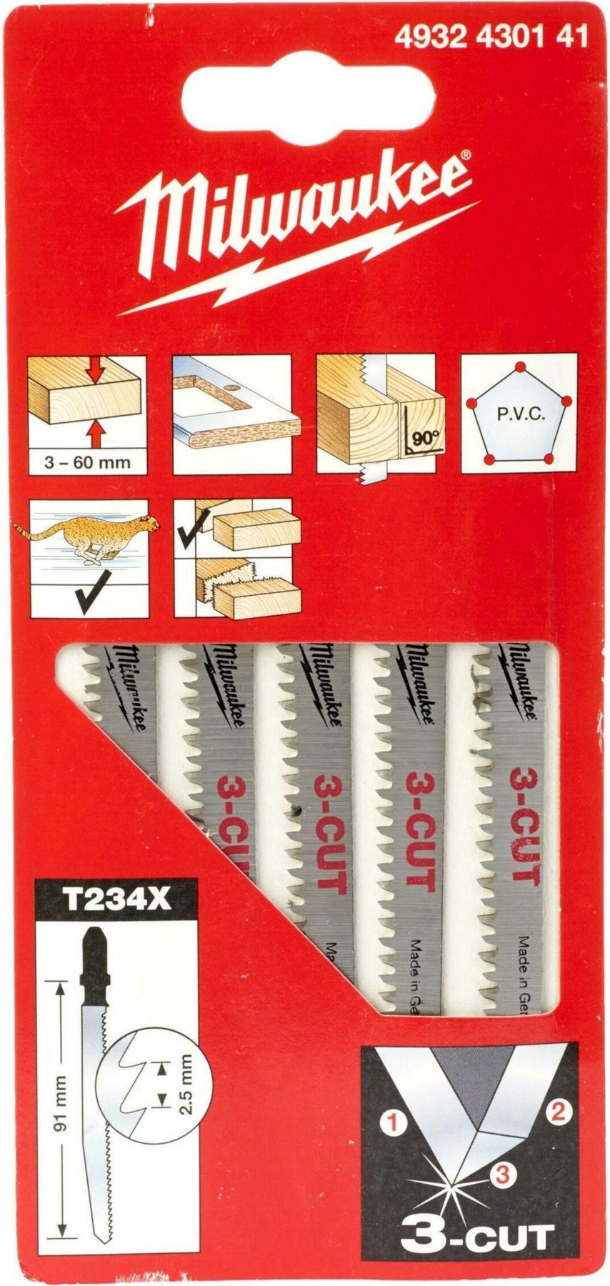 Полотно пиляльне для електролобзика Milwaukee T234X 3CUT по дереву, крок зуба 2.5ммх91мм, 5шт