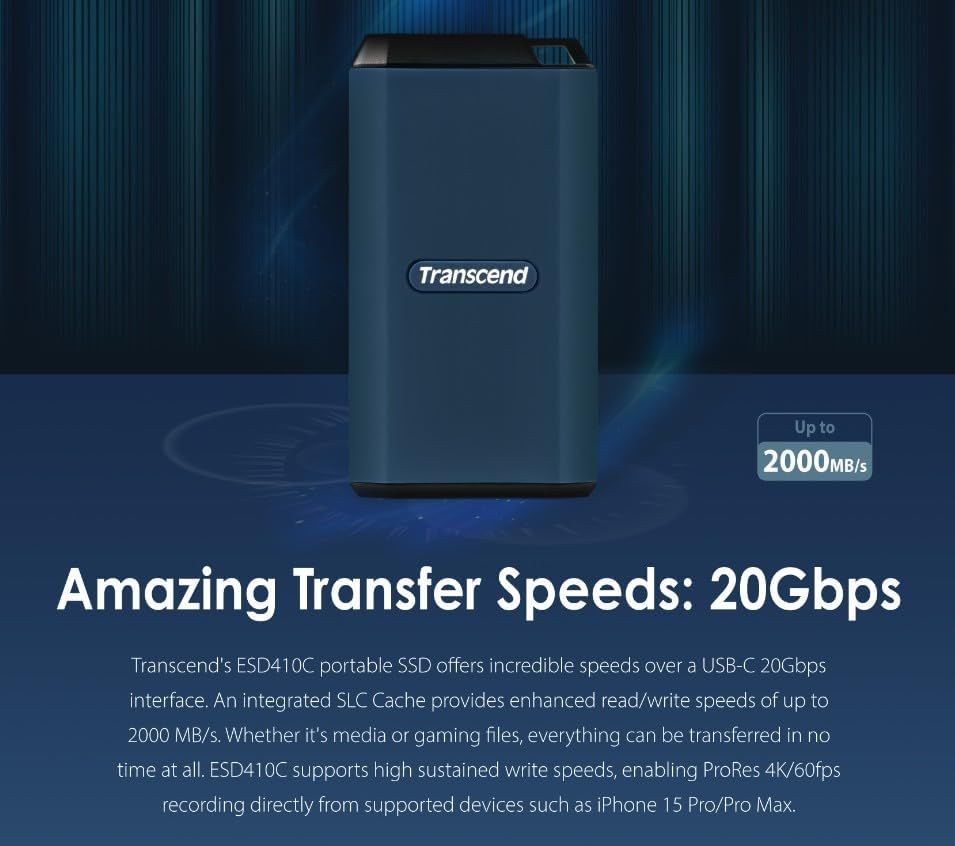 Transcend ESD410C – це портативний SSD із ємністю 2 ТБ, що забезпечує блискавичну швидкість передачі даних завдяки інтерфейсу USB 3.2 Gen 2x2. Швидкість читання та запису сягає до 2000 МБ/с, що дозволяє швидко копіювати великі файли, редагувати відео в реальному часі та створювати резервні копії без зайвих затримок. Компактний і міцний корпус має сучасний дизайн і надійно захищає накопичувач від ударів.