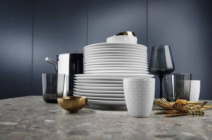 Короби для посуду:Верхній короб із можливістю регулювання по висоті, Поличка для чашок у верхньому коробі, Верхній кошик із FlexiLift, Нижній кошик із фіксованою підставкою для тарілок, Кошик для столових приборів