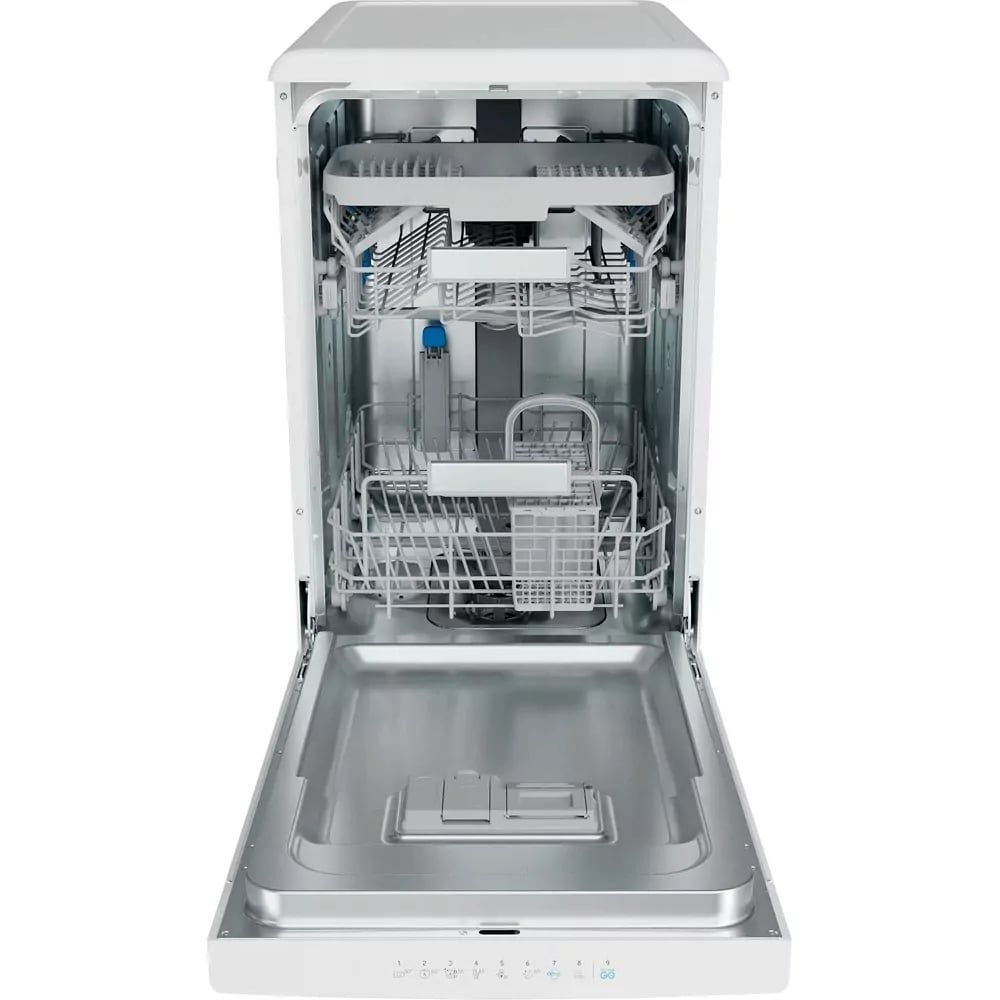 Посудомийна машина Indesit DSFO3T224C — це вузька модель шириною 45 см, яка вміщує до 10 комплектів посуду. Завдяки інверторному двигуну вона працює тихо та енергоефективно (A++), споживаючи лише 9–11 літрів води за цикл. Функція Push&Go дозволяє запустити миття одним натисканням, а eXtra Size забезпечує простір для великого посуду. Машина оснащена 9 програмами, включаючи швидкий цикл на 30 хвилин, нічний режим та делікатне миття скла. Функції відкладеного старту, половинного завантаження та захисту від протікань роблять її зручною та безпечною у використанні.