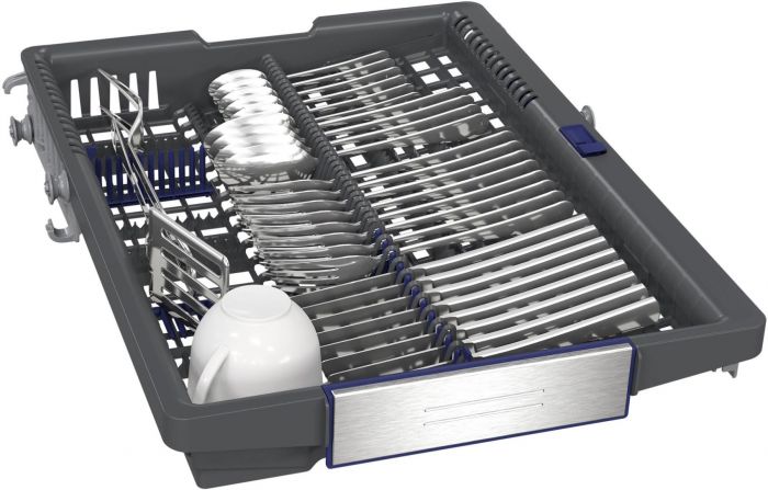 Короби для посуду:Верхній короб із можливістю регулювання по висоті, 4 складані решітки для тарілок у нижньому коробі, Поличка для чашок у верхньому коробі, Фіксатор для високих келихів у нижньому коробі, Стопер для запобігання виходу з рейок нижнього короба при висуванні, Висувний третій короб для столових приборів, 3 складані решітки для тарілок у верхньому коробі