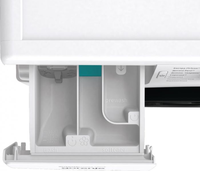 Програми:Бавовна, Вовна, Синтетика, Пухові речі, інтенсивна, Віджимання, Дитячий одяг, Щоденне прання, Гігієнічна, Полоскання, Усунення хутра тварин, Змішані тканини, Сорочки, ЕКО, Швидке прання 20'