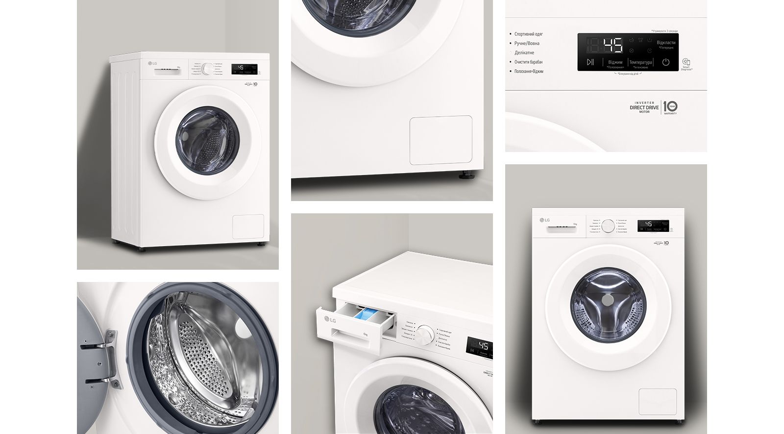Особливості:блокування панелі керування, Smart Diagnosis, Блокування від дітей, Зменшення рівня вібрації, Система прямого приводу Inverter Direct Drive, Технологія ''6 рухів турботи'' 6 Motion, індикатор залишкового часу, Функція прання парою Steam™, Автоматичний перезапуск із збереженням попередніх налаштувань, Система зменшення рівня вібрації, Система контролю піноутворення, Технологія контролю напруги (174-400 В), Розміщення секції для пом'якшувача у лотку для мийних засобів: між секціями для звичайного та попереднього прання