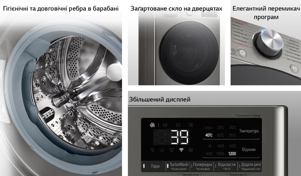 Особливості:Smart Diagnosis, TurboWash, Технологія визначення властивостей тканини AI DD ™, Технологія ''6 рухів турботи'' 6 Motion, Індикація залишкового часу програми, Інтелектуальні функції LG ThinQ™ (Wi-Fi), індикатор етапу циклу прання, індикація обраних параметрів програми прання, індикація незачинених дверцят, індикація помилок у роботі, затримка завершення циклу прання (3-19 годин), автоматичний перезапуск зі збереженням попередніх налаштувань, блокування панелі керування від дітей, Функція обробки парою Steam, 'Система зменшення рівня вібрації, Індикація завершення роботи, відкриття дверей: праворуч, Збільшений розмір перемикача програм, індикація режиму "Відкласти завершення", індикація режиму "Блокування від дітей", індикація режму "Віддалений старт", Завантаження додаткових програм через додаток LG ThinQ™ по Wi-Fi