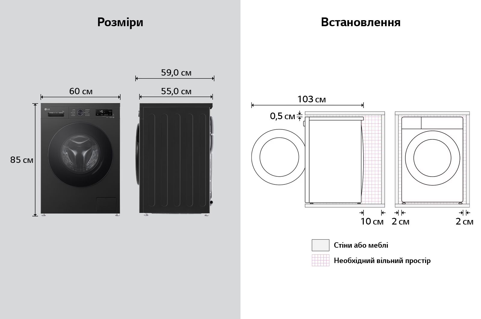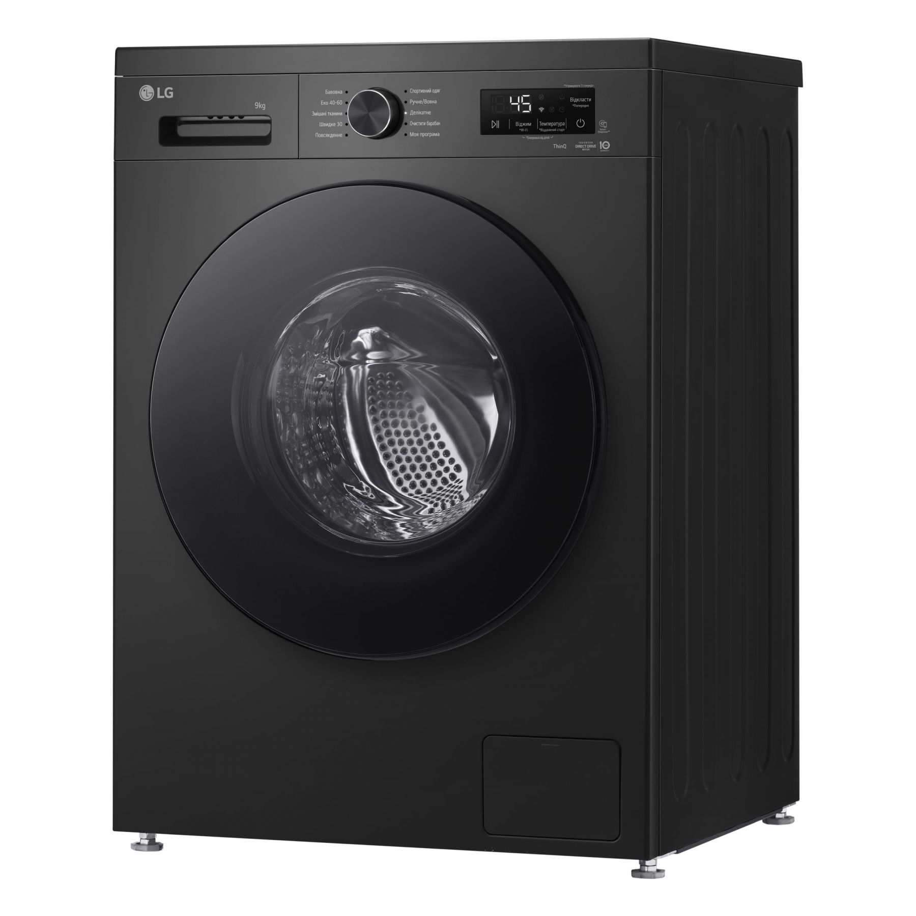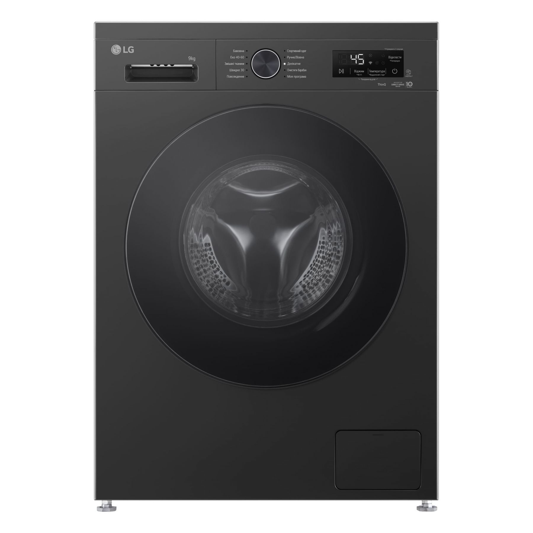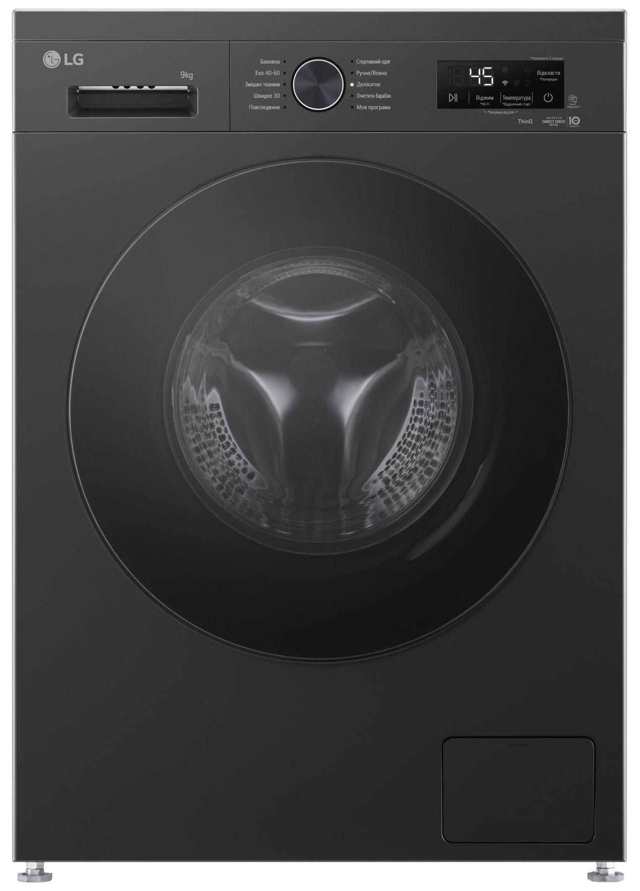 Програми:Бавовна, Швидке прання, Спортивний одяг, Делікатна, Моя програма, Еко 40-60, Змішані тканини, Додаткові програми прання, що завантажуються через додаток LG ThinQ, Вовна / Ручне прання, Повсякденне прання, Очищення барабану