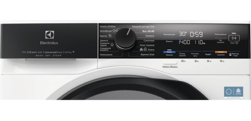 Програми:Бавовна, Вовна, Синтетика, Тонкі тканини, Джинси, Куртки, ополіскування, Еко 40-60, Освіження з обробкою парою, Віджимання/злив, Очищення машини, OneGo 20/60 хв, Швидкий догляд 59 хв