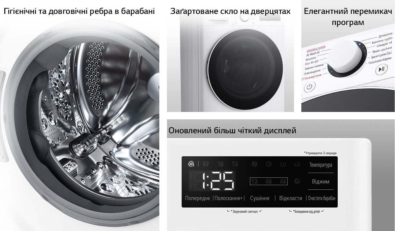 Особливості:Функція очищення барабана, Smart Diagnosis, Технологія визначення властивостей тканини AI DD ™, Технологія ''6 рухів турботи'' 6 Motion, індикатор залишкового часу, Функція прання парою Steam™, Технологія сушки: конденсаційна, Автоматичний перезапуск із збереженням попередніх налаштувань, Конденсаційна система сушіння, Система зменшення рівня вібрації, Система контролю піноутворення, Технологія контролю напруги (174-400 В), індикатор етапу циклу прання, індикація незачинених дверцят, індикація помилок у роботі, затримка завершення циклу прання (3-19 годин), можливість додати речі після початку циклу прання, автоматичний перезапуск зі збереженням попередніх налаштувань, блокування панелі керування від дітей, Функція обробки парою Steam, Бульбашкова поверхня барабана, Функція сушки конденсаційного типу, Функція прання з обробкою парою Steam, відкриття дверей: праворуч, індикація режиму "Відкласти завершення", індикація режиму "Блокування від дітей", індикація обраних параметрів програми, TurboWash 360˚