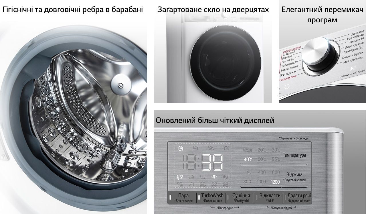 Особливості:Smart Diagnosis, Технологія визначення властивостей тканини AI DD ™, Функція сушки EcoHybrid, Технологія ''6 рухів турботи'' 6 Motion, Функція прання парою Steam™, Віддалене керування через додаток LG ThinQ по Wi-Fi, Автоматичний перезапуск із збереженням попередніх налаштувань, Індикація залишкового часу програми, Система зменшення рівня вібрації, Система контролю піноутворення, Технологія контролю напруги (174-400 В), індикатор етапу циклу прання, індикація режиму "Блокування від дітей, індикація незачинених дверцят, індикація помилок у роботі, затримка завершення циклу прання (3-19 годин), блокування панелі керування від дітей, Функція обробки парою Steam, відкриття дверей: праворуч, Збільшений розмір перемикача програм, індикація режиму "Відкласти завершення", індикація режму "Віддалений старт", індикація обраних параметрів програми, Можливість завантажити додаткові програми прання, що завантажуються через додаток LG ThinQ, TurboWash 360˚, Завантаження додаткових програм через додаток LG ThinQ™ по Wi-Fi, Можливість завантажити додаткові програми сушіння, що завантажуються через додаток LG ThinQ