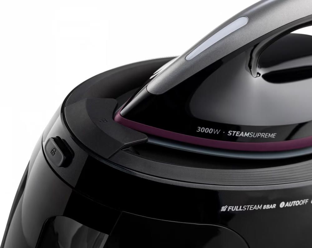 Особливості:Дисплей, Ергономічний дизайн, гумові ніжки, автоматичне вимкнення живлення, світлова індикація температури, прасування з сухою парою, позначки рівня води, безпечне прасування, знімний бак для води, відділення для зберігання шнура, індикація температури, система проти накипу, індикатор зносу картриджу від накипу, вертикальна пара