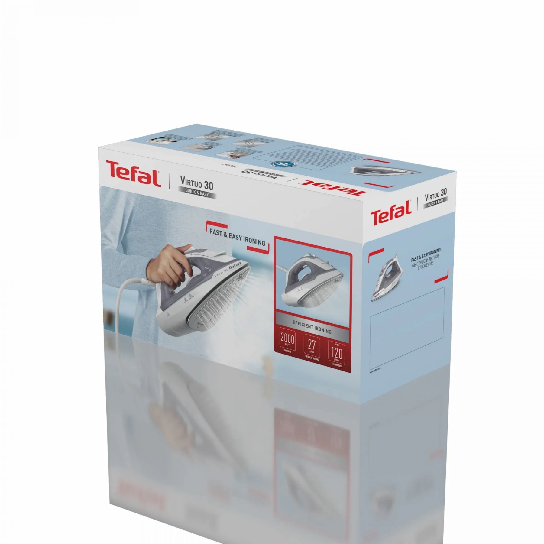 Праска Tefal Virtuo 30 забезпечує швидке та ефективне прасування завдяки потужності 2000 Вт, нагріванню за 30 секунд та постійній подачі пари до 27 г/хв. Потужний паровий удар 120 г/хв розгладжує навіть найстійкіші складки, а керамічна підошва гарантує легке ковзання. Ідеальна для щоденного використання, включно з вертикальним відпарюванням.