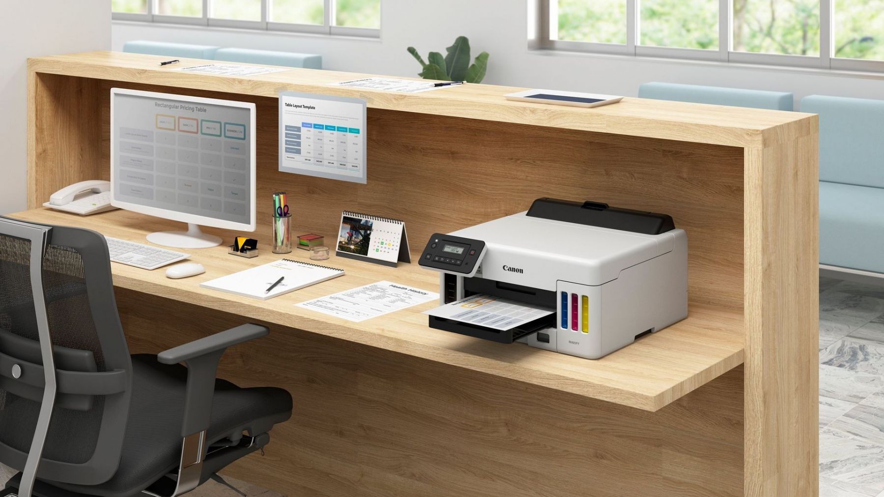 Високопродуктивний кольоровий струменевий принтер з СНПЧ, який може стати відмінним вибором для частого та об'ємного друку. Максимальне щомісячне навантаження сягає 45 000 сторінок. Модель підтримує бездротове підключення Wi-Fi Direct, AirPrint. Є мережева синхронізація через Wi-Fi і LAN, а також класичне підключення за допомогою поширеного інтерфейсу USB. Друкарська техніка забезпечена дуже зручною поворотною панеллю із сенсорним введенням та 2-рядковим РК-екраном.
