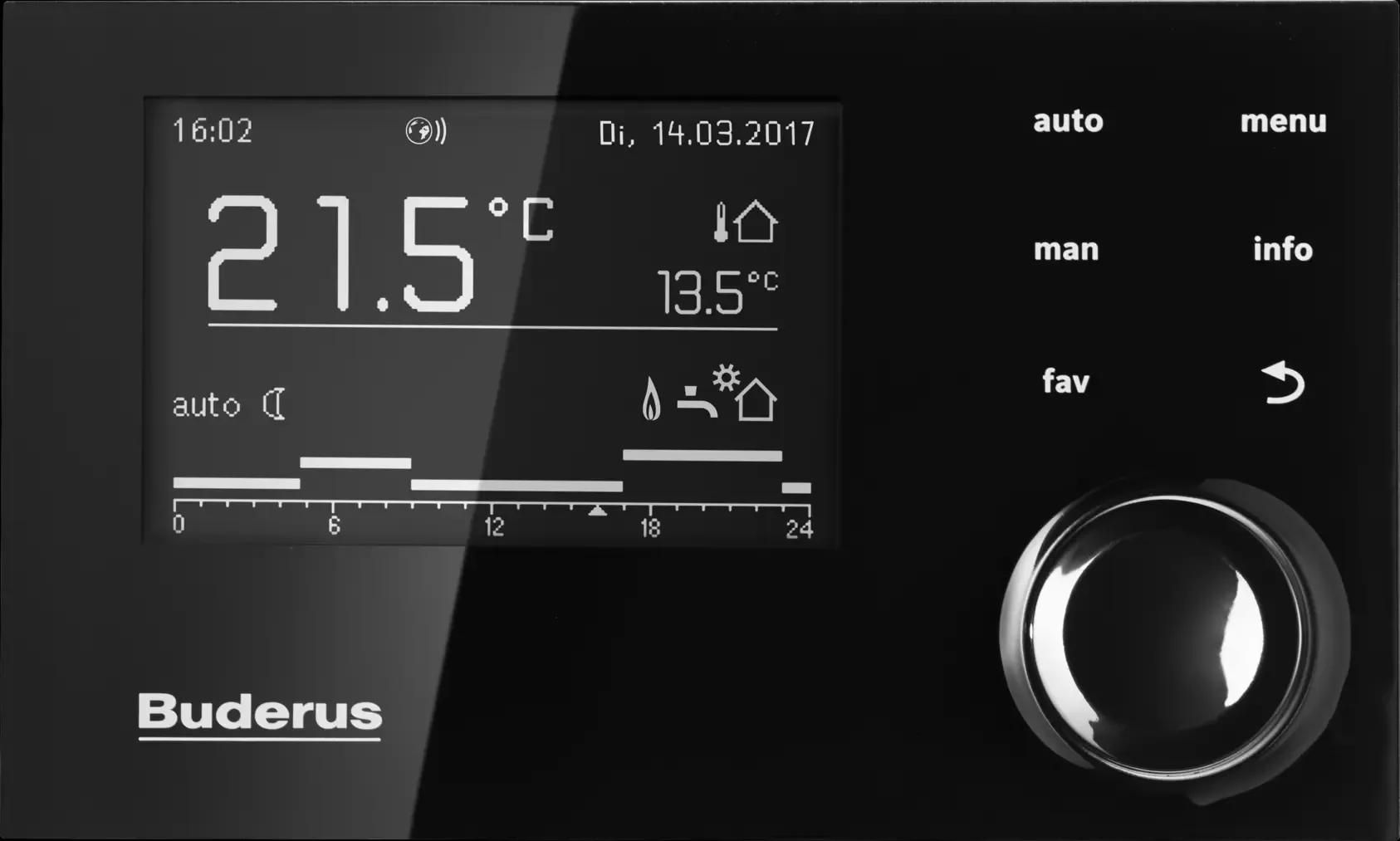 Пристрій керування Bosch RC310 (7738111127) для систем опалення з шиною Logamatic EMS/EMS plus. Оснащений графічним дисплеєм із підсвічуванням, забезпечує керування опалювальними контурами, ГВП та сонячними системами (за наявності модулів). Підтримує до 4 контурів, щоденні й тижневі програми, функцію «Метеостанція» та блокування клавіш.