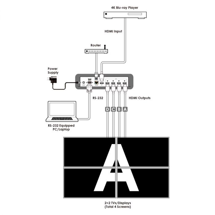 CDPS-4KQ-AD - контролер відеостіни розміром від 2х2 до 8х8 з інтерфейсом HDMI і підтримкою роздільної здатності до 1080p60. Сигнал UHD з HDR, отриманий з входу HDMI, прилад розподіляє на 4 дисплеї для відображення єдиною картинкою - у форматі відео стіни 2x2.