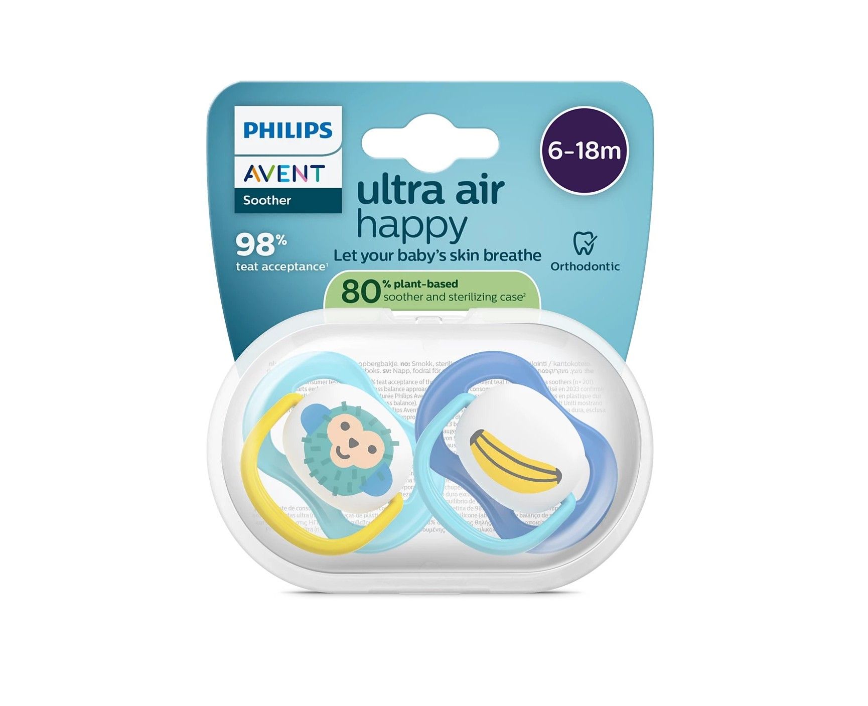 Пустушка Philips Avent Ultra Air 6–18 міс. (2 шт.) має надзвичайно великі вентиляційні отвори, щоб шкіра могла «дихати» та залишалась сухішою. Ортодонтична симетрична соска зі 100% харчового силікону підтримує природний розвиток ротової порожнини. Текстурований силікон дає знайоме відчуття та високу прийнятність у дітей. У комплекті футляр для швидкої стерилізації у мікрохвильовій печі.