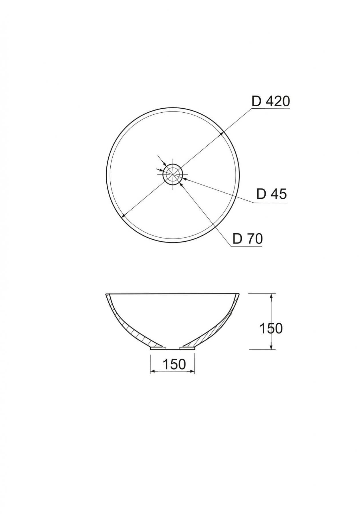 Раковина Adamant KREIS має круглу форму, виготовлена зі штучного каменю з розмірами 420 x 150 мм та білим кольором. Накладний тип встановлення без отвору для змішувача та переливу дозволяє монтаж зверху на стільницю. Матеріал створений за технологією Solid Surface, стійкий до впливу та довговічний.