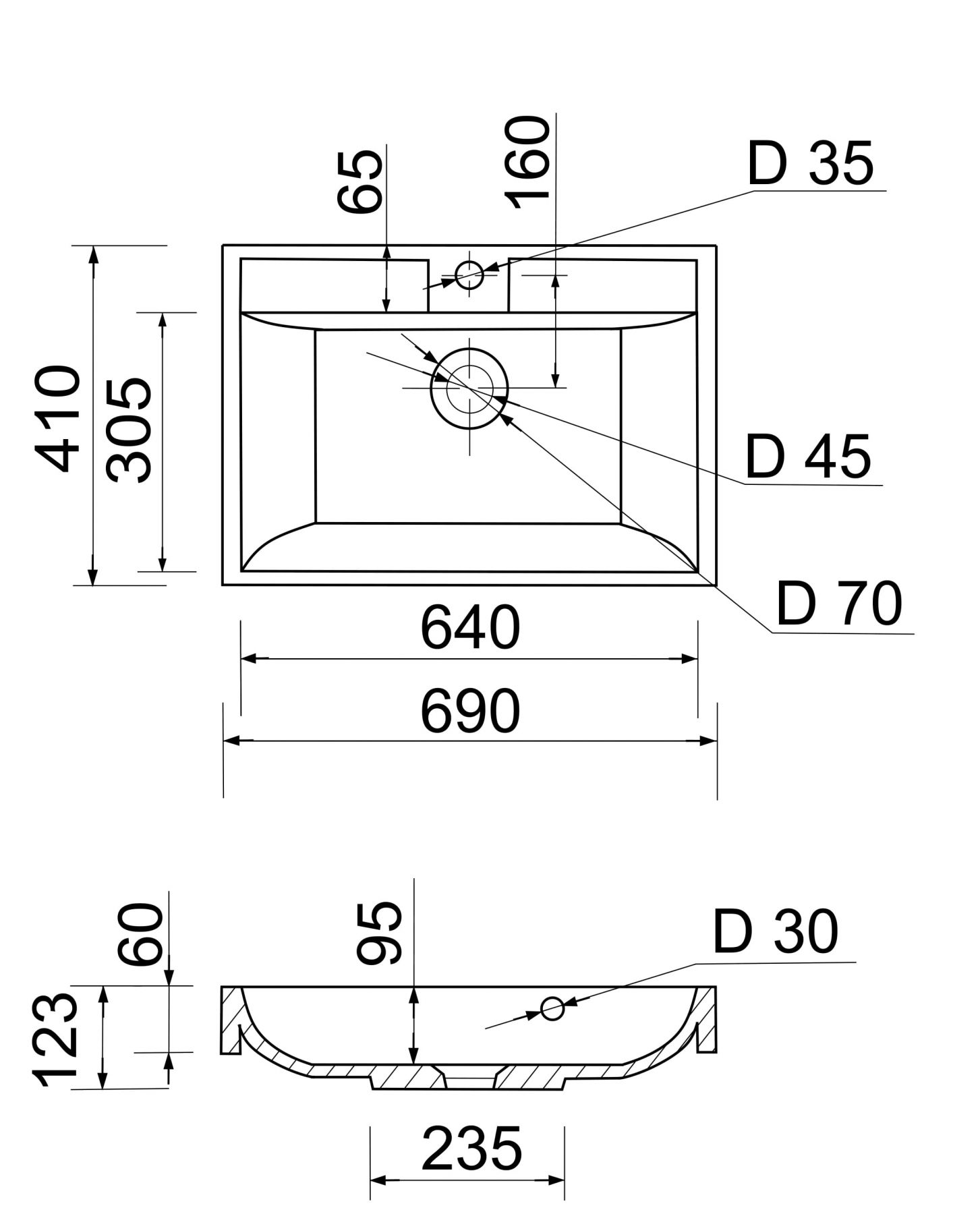 Раковина Adamant STRENG NEW має прямокутну форму, виготовлена зі штучного каменю з розмірами 690 x 410 x 123 мм та білим кольором. Накладний тип встановлення з отворами для змішувача та переливу дозволяє монтаж на тумбу. Матеріал створений за технологією Solid Surface, стійкий до впливу та довговічний.