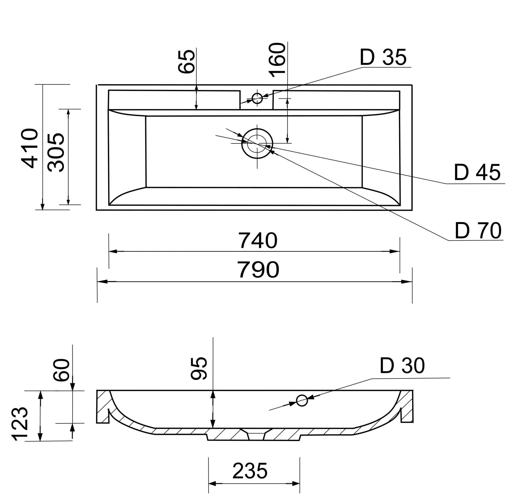 Раковина Adamant STRENG NEW має прямокутну форму, виготовлена зі штучного каменю з розмірами 790 x 410 x 123 мм та білим кольором. Накладний тип встановлення з отворами для змішувача та переливу дозволяє монтаж на тумбу. Матеріал створений за технологією Solid Surface, стійкий до впливу та довговічний.