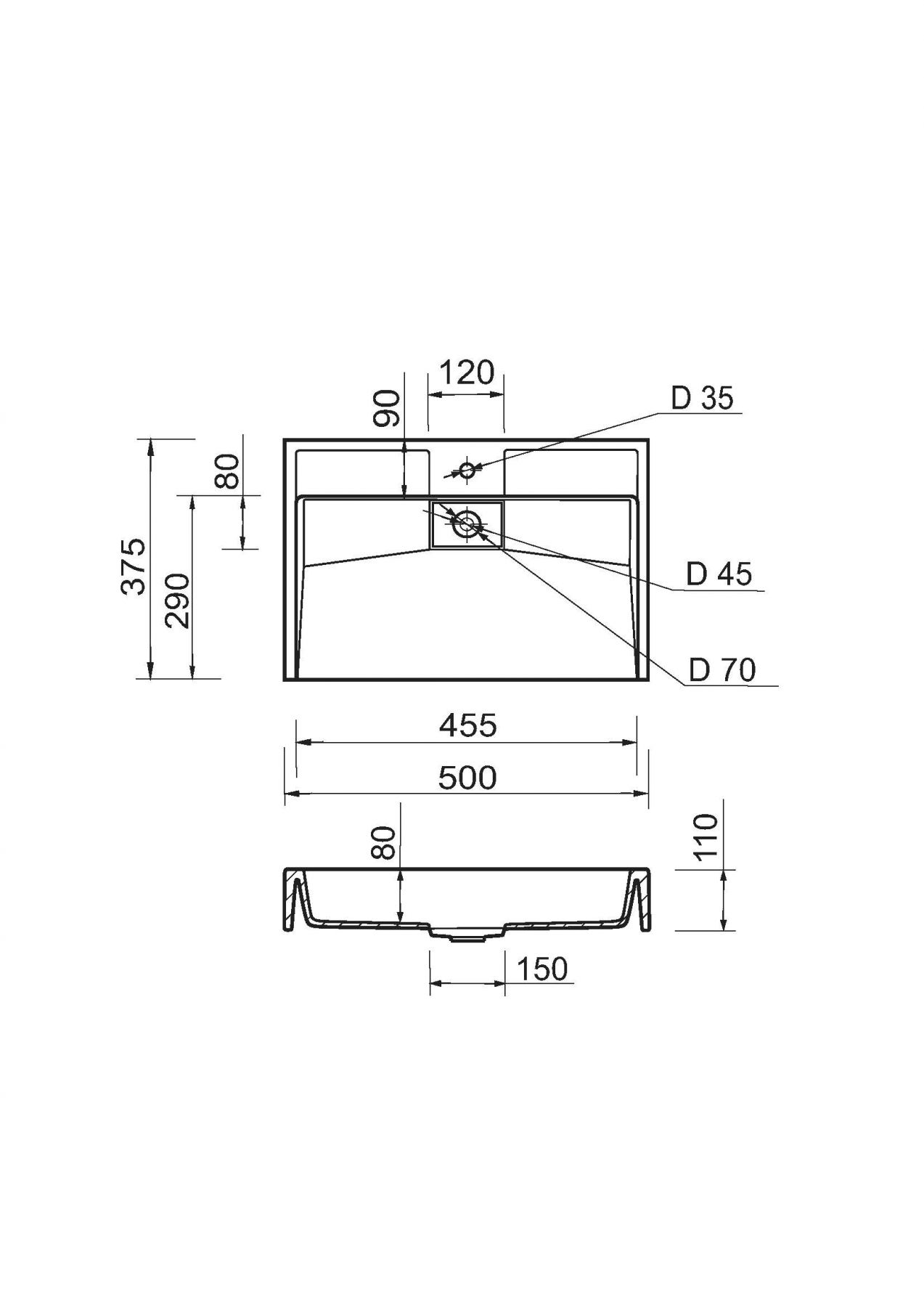 Раковина Adamant VISION має прямокутну форму, виготовлена зі штучного каменю з розмірами 500 x 380 x 110 мм та білим кольором. Накладний тип встановлення з отвором для змішувача та без отвору для переливу дозволяє монтаж на тумбу. Матеріал створений за технологією Solid Surface, стійкий до впливу та довговічний.