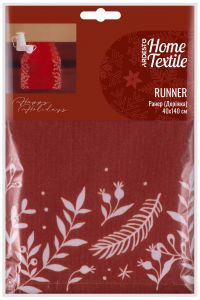 Ранер ARDESTO Happy Holidays стильний елемент сервірування, який має декоративне призначення. Розмір ранера з поліестеру (90 %) та бавовни (10 %) становить 40 × 140 см. Догляд за виробом нескладний і передбачає: прання в пральній машині за 30 °C на делікатному режимі; сушіння в машині за низької температури; заборона відбілювання; заборона чищення будь-яким розчинником, крім трихлоретилену; прасування за температури до 110 °C. Ранер червоного кольору можна використовувати самостійно чи поєднувати зі скатертинами серії Happy Holidays.