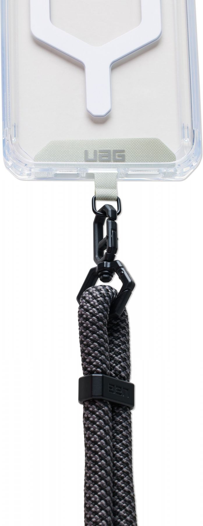 Ремінець виготовлений з високоякісного тканого поліестеру товщиною 10 мм, що робить його легким та зручним для повсякденного носіння. Регульована довжина забезпечує ідеальну посадку у будь-якій ситуації. Міцний спеціальний роз'єм для шнурка і міцний карабін, що обертається, дозволяють надійно утримувати телефон на місці навіть під час найактивніших занять.