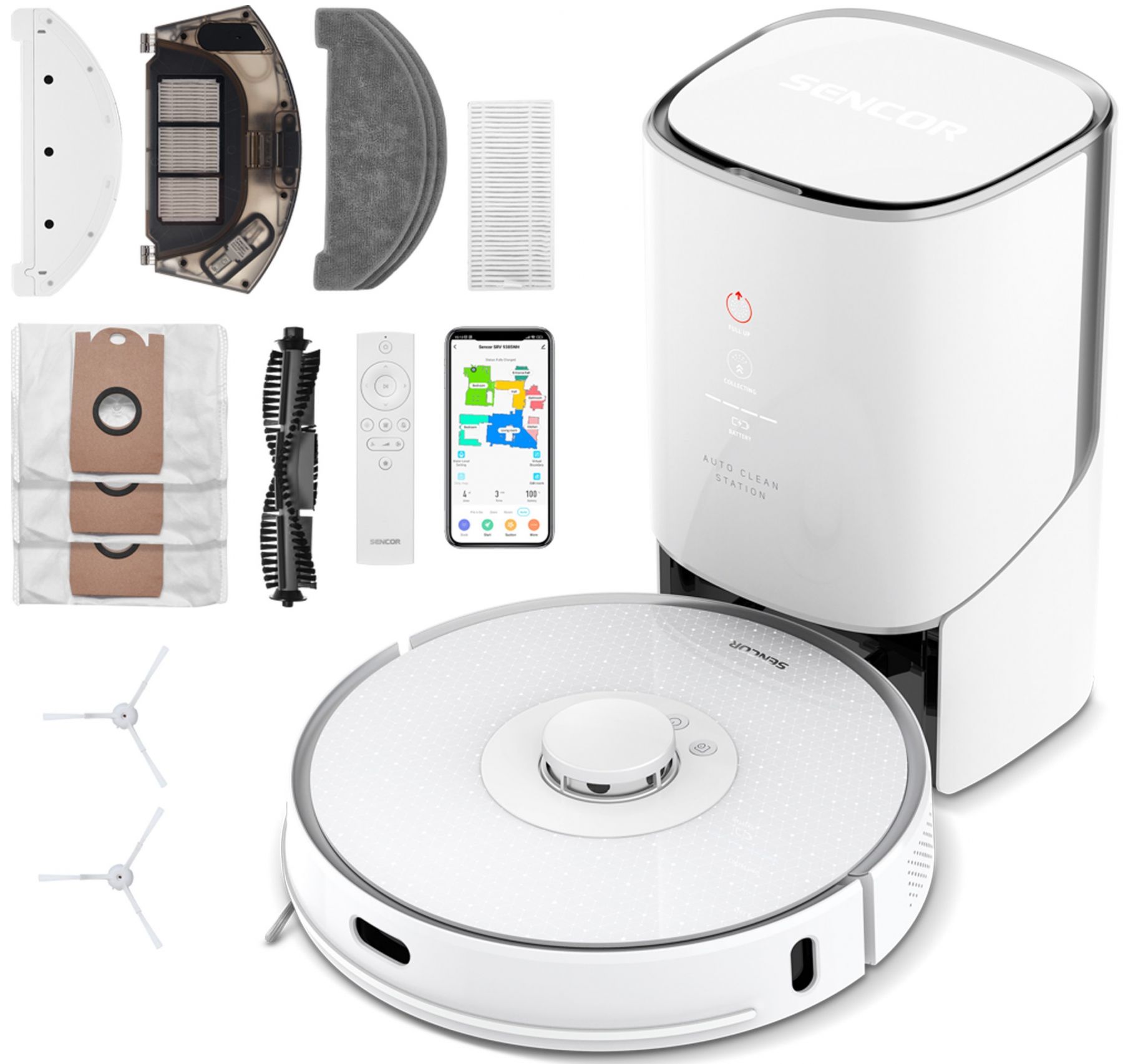 Робот-пилосос Sencor , 400Вт, h=9,8см, вологе прибирання, конт пил -0,45л, вода -0,24л, автон. робота до 120хв, вага-2,5кг, НЕРА, самоочистка, білий