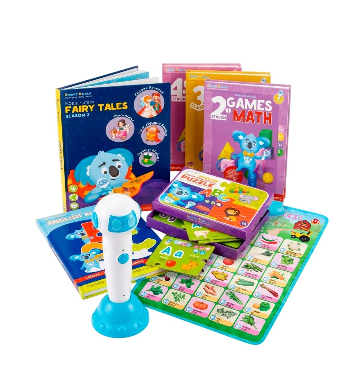 Стартовий набір Smart Koala містить інтерактивну ручку та демо-книгу «Коала Пізнавала» з трьома уроками. Ручка озвучує матеріал усіх книг серії після завантаження файлів. До комплекту входять три сезони книг англійської мови, книги ігор математики, казок, алфавіту та аудіо-додатки. Дитина опановує лексику, фрази та логічні завдання через озвучені сцени та ігри.