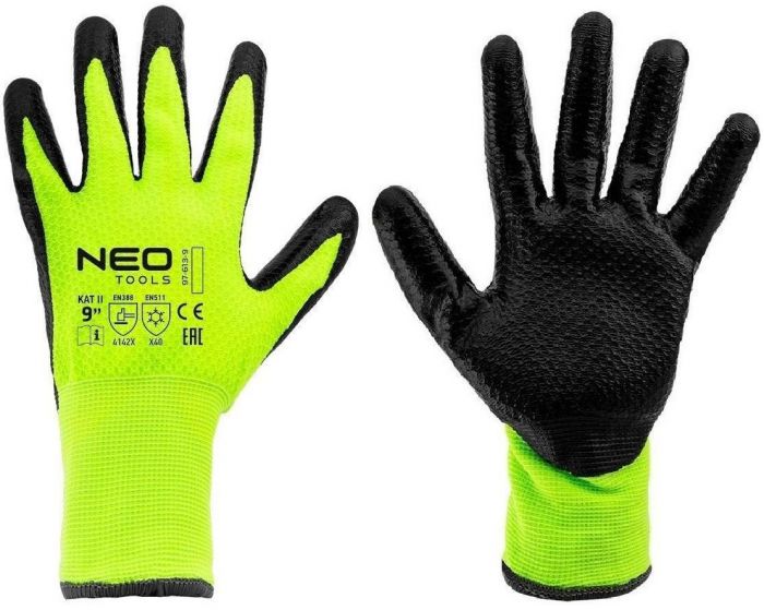 Утеплені робочі рукавички NEO розміру 9, нейлон з латексним покриттям, 4142X 97-613-9, виготовлені з нейлону з латексним покриттям. Вони мають високу стійкість до стирання (від 0 до 4) 4, стійкість до порізів гострими предметами (від 0 до 5) 1, стійкість до розриву (від 0 до 4) 4 та стійкість до проколу (від 0 до 4) 2. Вони також відрізняються стійкістю до порізів відповідно до EN ISO 13997 X. Рукавички добре сидять на руці. Вони можуть використовуватися для всіх видів транспортування, переміщення, зберігання, складальних робіт, виробництва дрібних деталей, DIY, автомобілебудування та садівництва. Вони захищають руки від холоду, бруду, подряпин, відбитків та шкідливих умов праці. При правильній конструкції - запобігає вислизанню інструментів з рук. Маркування CE на відповідність стандартам EN 388, 22242X та EN511, що забезпечує захист від холоду, є гарантією безпеки, що підтверджує, що продукт марки NEO відповідає всім вимогам СЕ.
