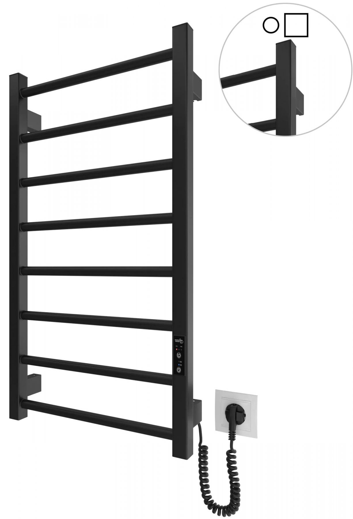 Електрична рушникосушарка HF Leeds 770×530. Працює за технологією сухого ТЕНу. Обладнана вбудованим таймер-регулятором і конектором для підключення до живлення з будь-якого боку.