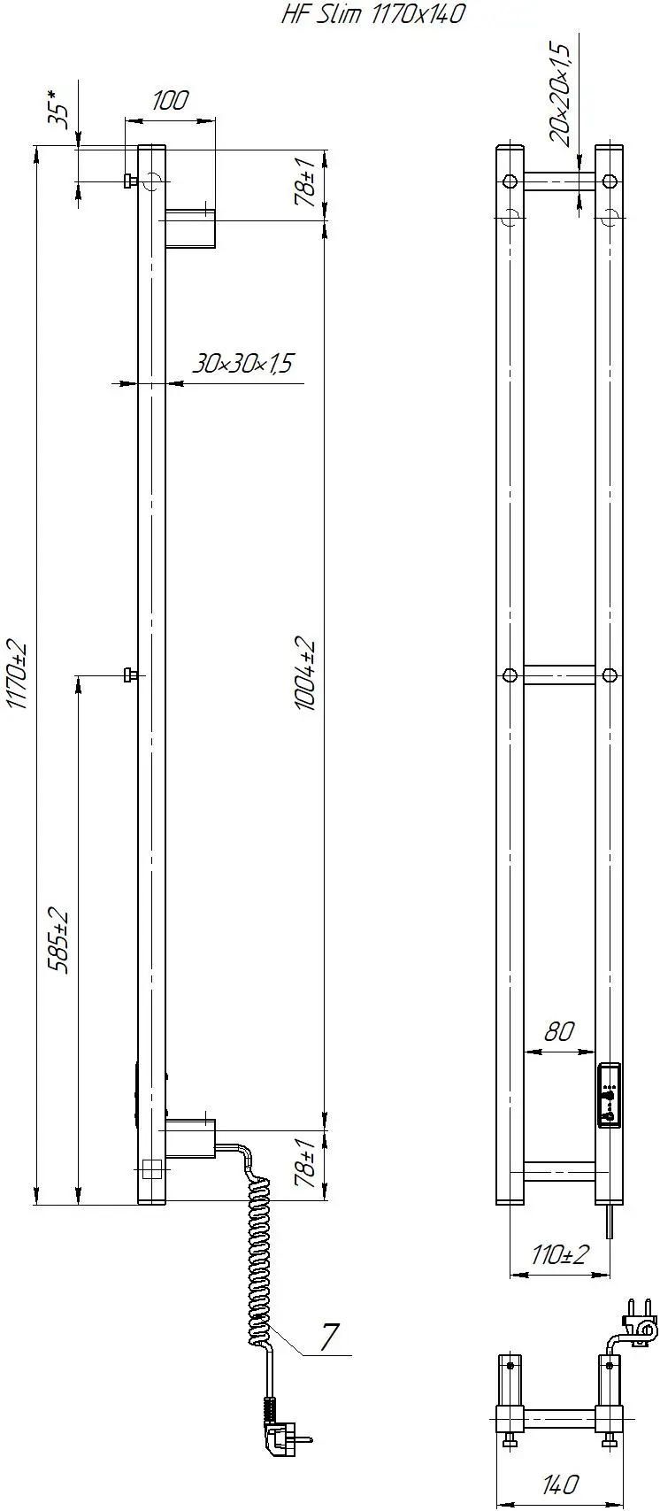 Електрична рушникосушарка HF Slim 1170х140. Працює за технологією сухого ТЕНу. Обладнана вбудованим таймер-регулятором і конектором для підключення до живлення з будь-якого боку. Оснащена комплектом для прихованого підключення. Модель має 2 ребера з круглої труби та стійки з квадратного профілю. Матеріал – чорна сталь з антикорозійною обробкою. Варіанти покриття: чорний мат або білий мат. Температурні режими таймер-регулятора: 40°С, 45°С, 50°С. Час роботи: 3, 6 годин або постійний нагрів. Потужність 80 Вт. Гарантія – 3 роки.