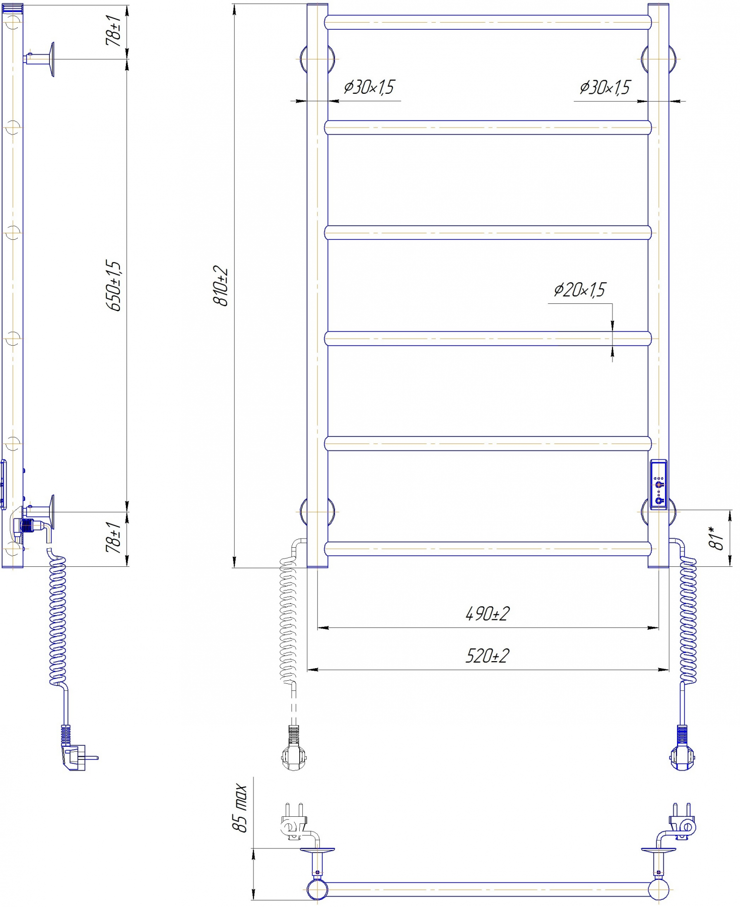 Електросушарка для рушників побутова Класік F НР-I 800х530/75 TR K. Обладнана таймер-регулятором та конектором для підключення в розетку з будь-якого боку. Сумісна з комплектом прихованого підключення. Має 6 ребер та стояки з круглої труби.