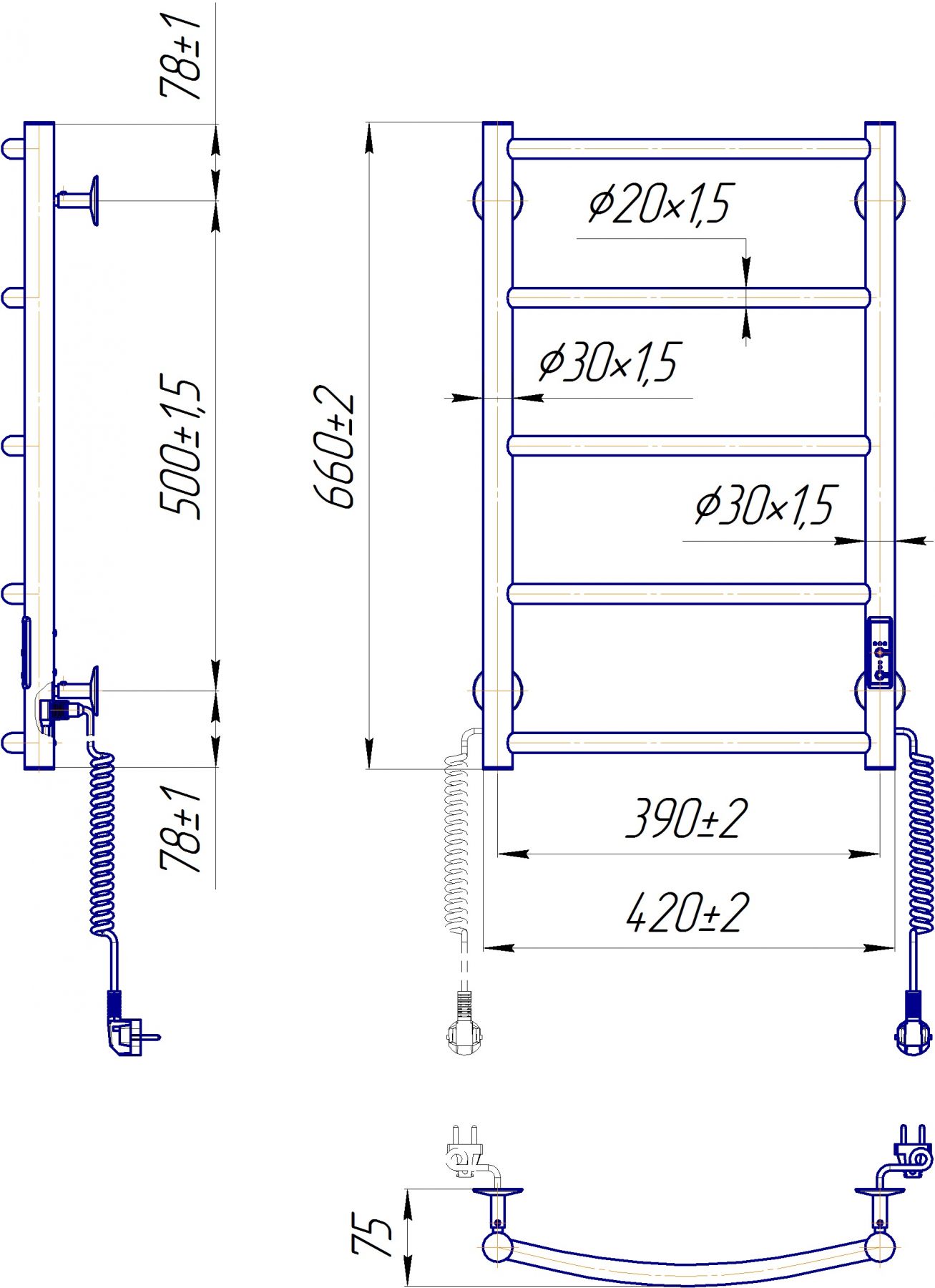 Електрична рушникосушарка Класік НР-I 650х430/75 TR K. оснащена таймер-регулятором і розємом для підключення до розетки з обох сторін.