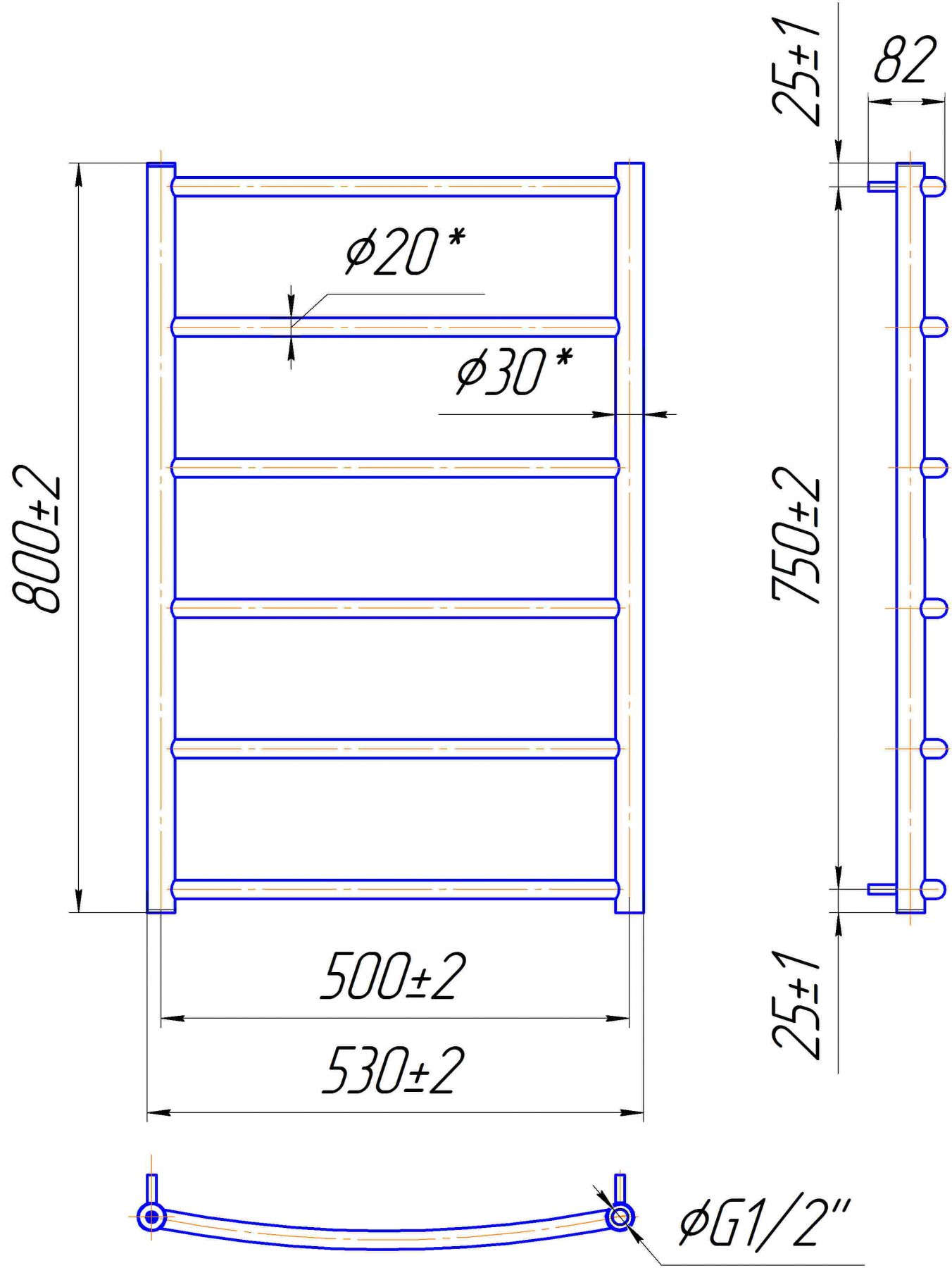 Рушникосушарка "Маріо" Класік 800х530/500. Розміри: висота - 800 мм, ширина - 530 мм, глибина 105 мм, міжцентрова відстань для підключення - 500 мм, діаметр підключення G1/2''. Варіанти підключення: нижнє, діагональне та бічне. Кількість ребер - 8, стояки з круглої труби. Виготовлена з полірованої нержавіючої сталі без хромування.