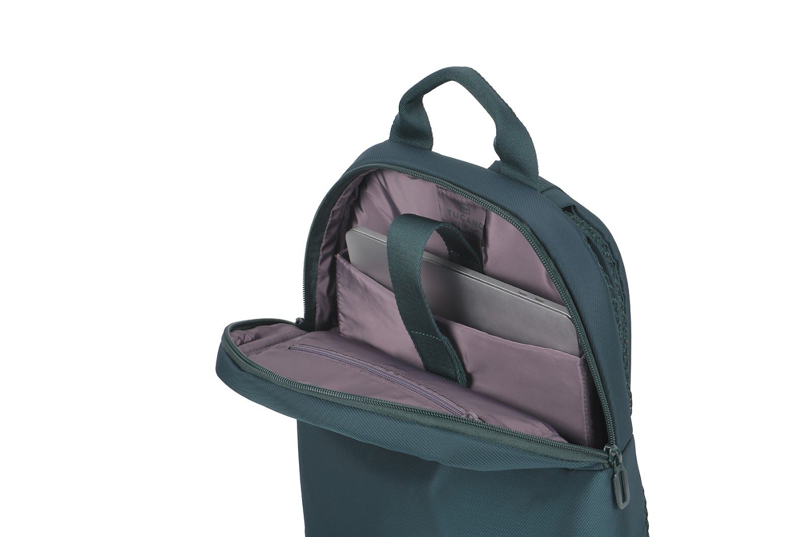 Рюкзак Tucano Fine 13"/14" поєднує діловий стиль і комфорт у щоденному користуванні. Виготовлений із високотехнологічної тканини з переробленого пластику та прикрашений шкіряними акцентами. Місткі відділення забезпечують зручне розташування ноутбука, документів та аксесуарів. М’яке відділення зберігає ноутбук у безпеці, а ремінець на спинці дозволяє закріпити рюкзак на ручці валізи. Це надійний супутник для роботи, подорожей і міського ритму.