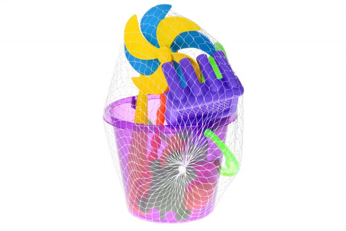В комплекті:лопатка, пасочки, іграшка-поплавок, граблі, відерце, вертушка