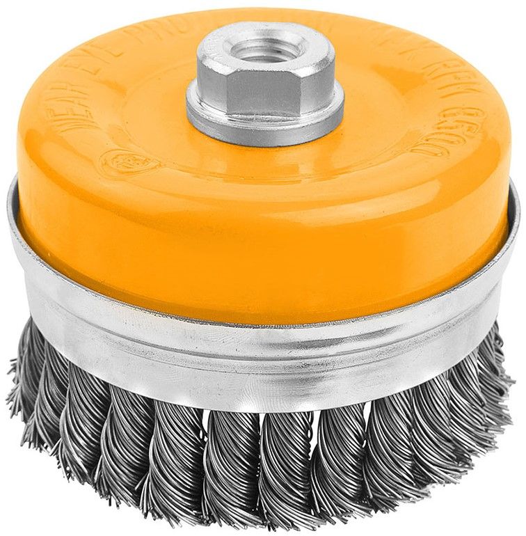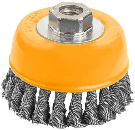 Чашкова щітка Tolsen 77611 діаметром 75 мм – професійний інструмент для видалення іржі, фарби, лаку та забруднень з металевих поверхонь. Оснащена сталевим дротом Ø0,5 мм та має різьблення M14х2, що забезпечує сумісність із кутовими шліфувальними машинами. Максимальна швидкість – 12500 об/хв, що дозволяє працювати на високих обертах із максимальною ефективністю.