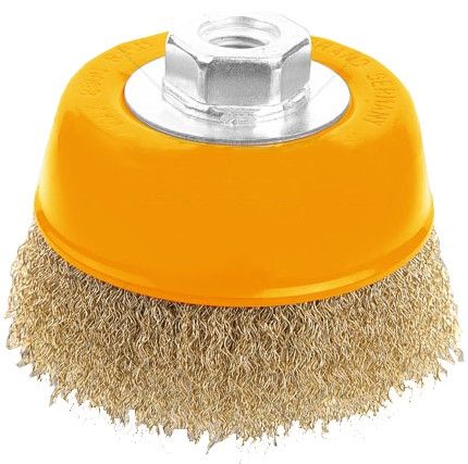 Чашкова щітка Tolsen Профі 77603 діаметром 125 мм призначена для відносно м’якої обробки поверхонь. Використовується з кутовими шліфувальними машинами для видалення іржі, фарби та лаку з металевих поверхонь. Оснащена сталевим латунованим дротом Ø0,3 мм, що забезпечує делікатне очищення без надмірного пошкодження матеріалу. Різьблення M14x2 дозволяє легко закріпити щітку, а максимальна швидкість 6500 об/хв гарантує ефективне та безпечне очищення.
