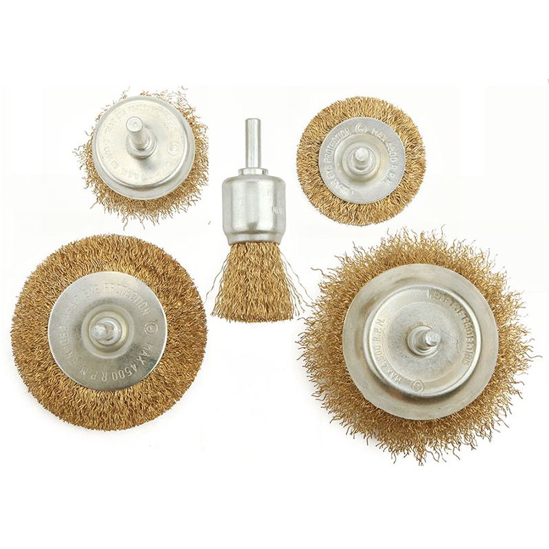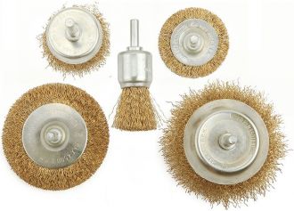 Набір з 5 шліфувальних щіток Tolsen Профі 77552 для використання з прямою шліфувальною машиною або дрилем. Оснащені хвостовиком 6.35 мм (1/4"), сталевим латунованим дротом діаметром 0.3 мм для м'якої обробки поверхонь. Підходять для видалення іржі, фарби, лаку. Максимальна швидкість – 4500 об/хв.