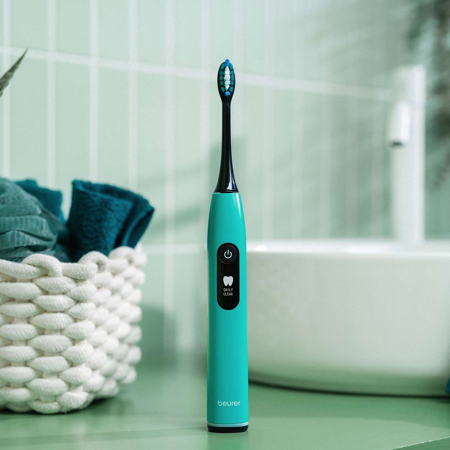 Beurer SC 50 Ocean Breeze GP — звукова зубна щітка у бірюзовому дизайні з п’ятьма режимами очищення, потужним акумулятором до 22 днів роботи та зручною магнітною станцією заряджання. Екоматеріали корпусу й щетинок, таймер, датчик тиску та індикація смайликами допомагають підтримувати щоденну гігієну ротової порожнини вдома і в дорозі.