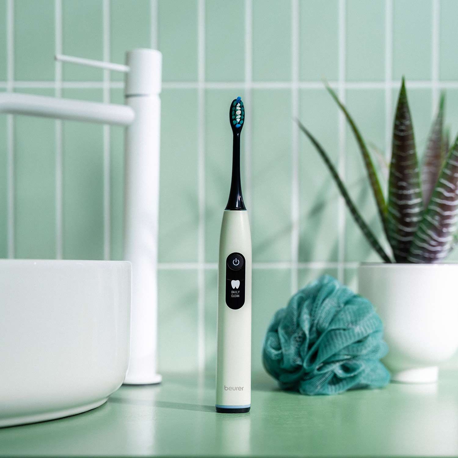 Beurer SC 50 Peppermint GP — звукова зубна щітка у м’ятному дизайні з п’ятьма режимами очищення, потужним акумулятором до 22 днів роботи та зручною магнітною станцією заряджання. Екоматеріали корпусу й щетинок, таймер, датчик тиску та індикація смайликами допомагають підтримувати щоденну гігієну ротової порожнини вдома і в дорозі.