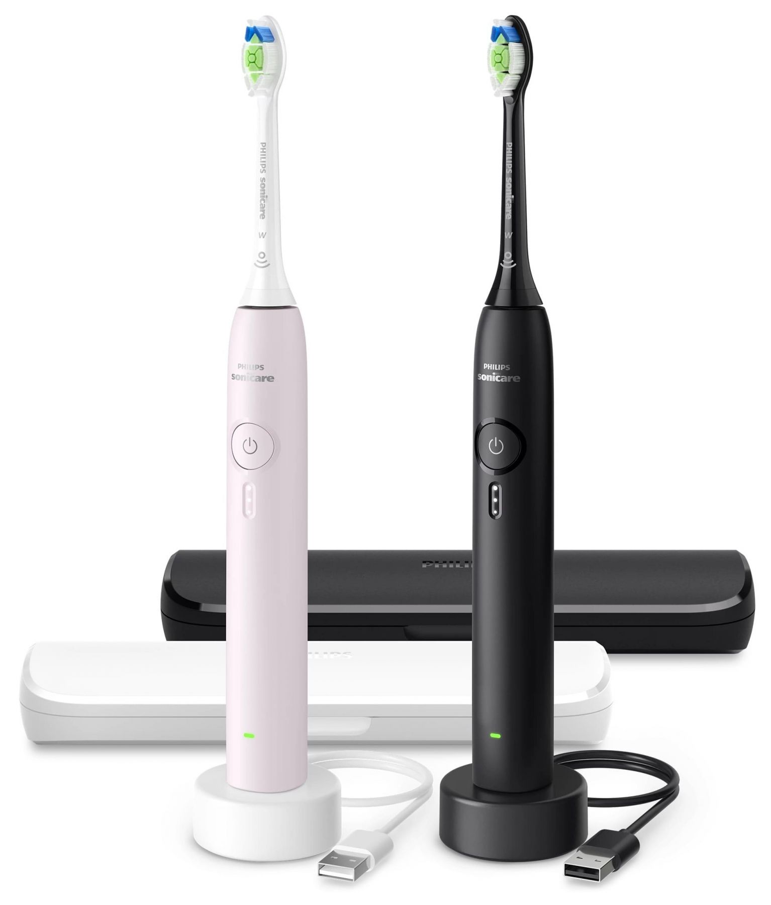 Набір електричних зубних щіток Philips Sonicare 3100 series з двох щіток у чорному та світло рожевому кольорах. Працюють на основі звукової технології Sonicare з частотою 31000 рухів щетинок за хвилину. Оснащені датчиком натиску, трьома рівнями інтенсивності та таймерами SmarTimer і QuadPacer. Забезпечують до 14 днів регулярного чищення від акумулятора.