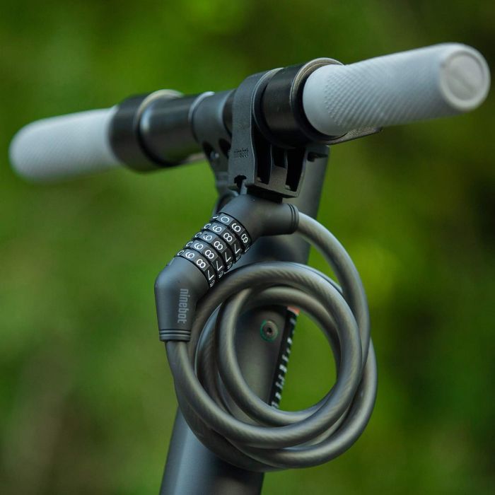 Виготовлений на замовлення фірмовий замок-трос протиугінний Ninebot підходить для всіх серій двоколісних електричних скутерів Ninebot. Замок легко фіксується на рульовій стійці транспортного засобу, забезпечуючи максимально надійну і безпечну парковку. Для зручного транспортування замок може бути закріплений на кермі скутера, шляхом його обмотки і замикання. Наявність великої кнопки блокування відкриває легкий доступ до замка після паркування.