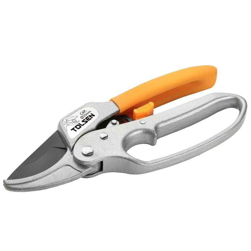 Секатор площинний Tolsen 31023 із храповим механізмом забезпечує покроковий різ гілок до 25 мм. Лезо з інструментальної сталі Mn65 має тефлонове покриття для зменшення тертя. Алюмінієва конструкція з порошковим покриттям і захистом пальців забезпечують комфорт і безпеку. Є блокувальний перемикач для зберігання в закритому вигляді.