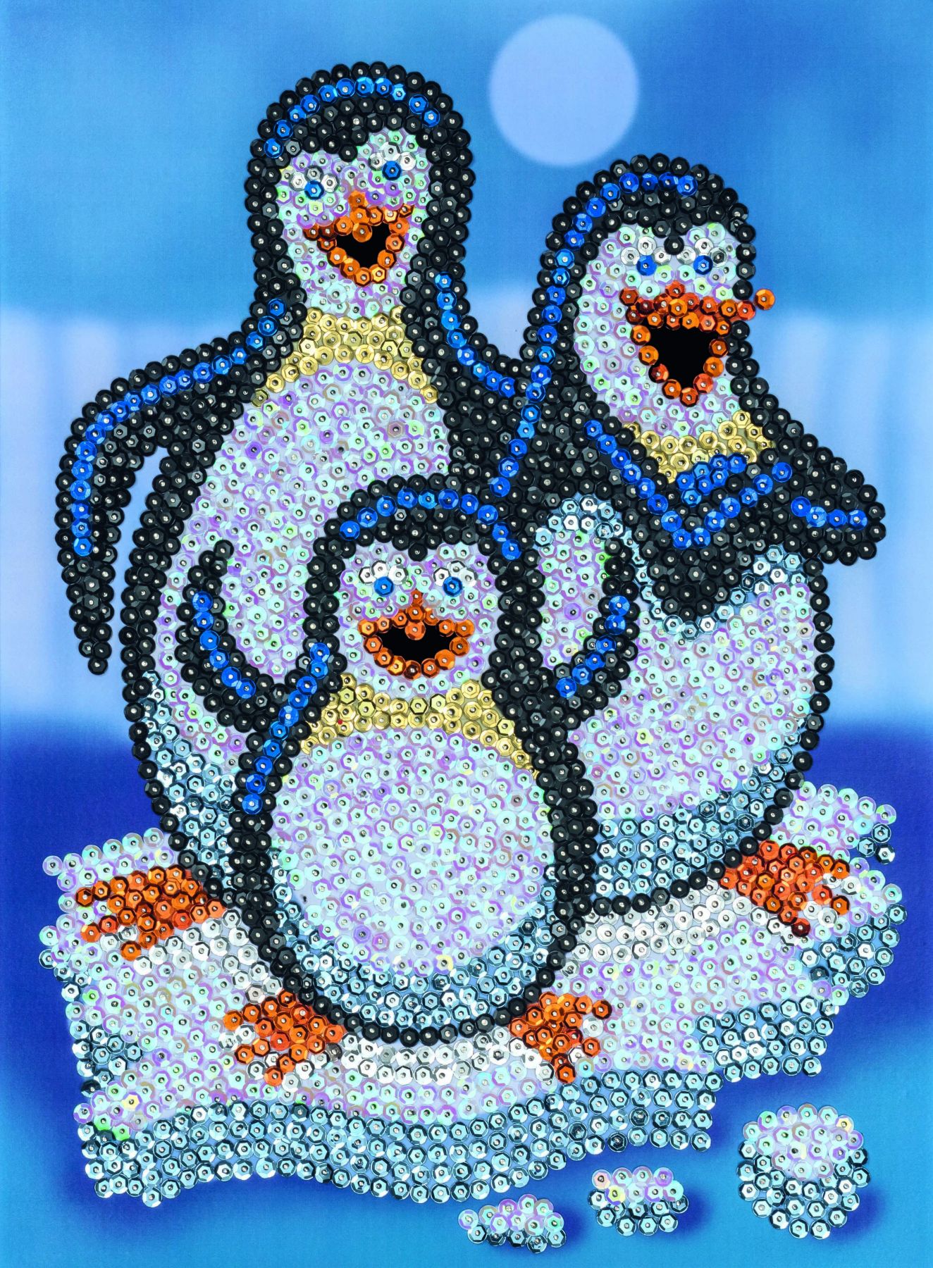 Сім'я веселих пінгвінів, які подорожують на льоду. Саме таку картину з блискіток ви зможете створити завдяки набору для творчості від Sequin Art. У комплекті ви знайдете все необхідне: трафарет, основу, кольорові блискітки, металеві шпильки та інструкцію. Готова картина розміром 25х34 см буде мерехтіти та піднімати настрій! Аплікації з блискіток - цікавий і захоплюючий процес, який вимагає уважності, посидючості й акуратності. Рекомендований вік: від 6 років.