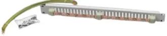 Це комплект заземлення стоєчного типу з 10 точками заземлення, мідною шиною завдовжки 400 мм, 4 жовто-зеленими заземлювальними кабелями діаметром 4 мм і монтажною пластиною 1U, сумісною з шафами 19″.