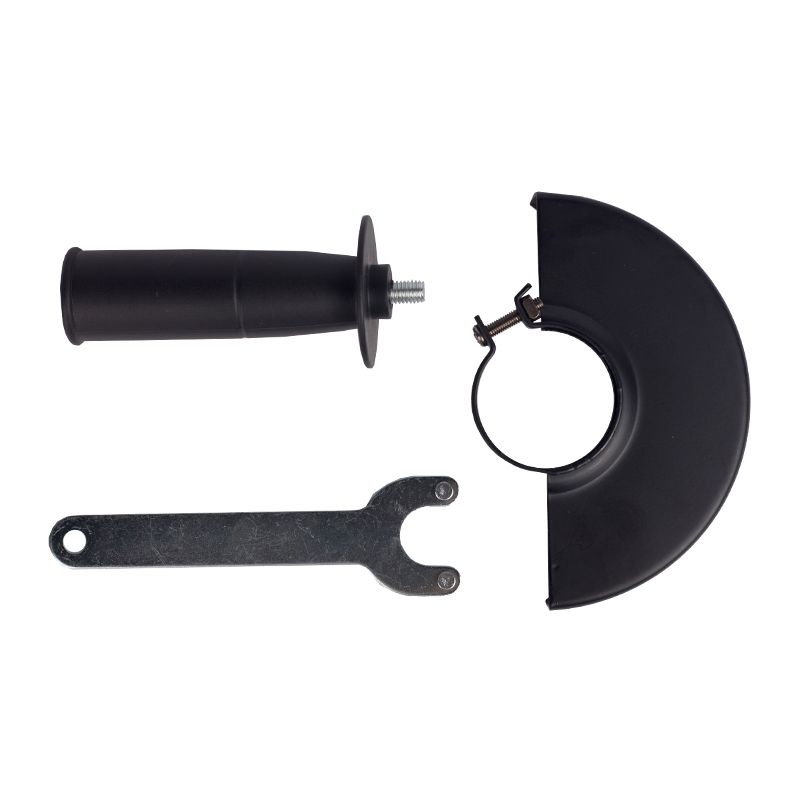 Комплектація:інструкція з експлуатації, Гарантійний талон, захисний кожух, передня рукоятка, пакувальна коробка, додаток, вилковий ключ, кутова шліфувальна машина, вугільна щітка