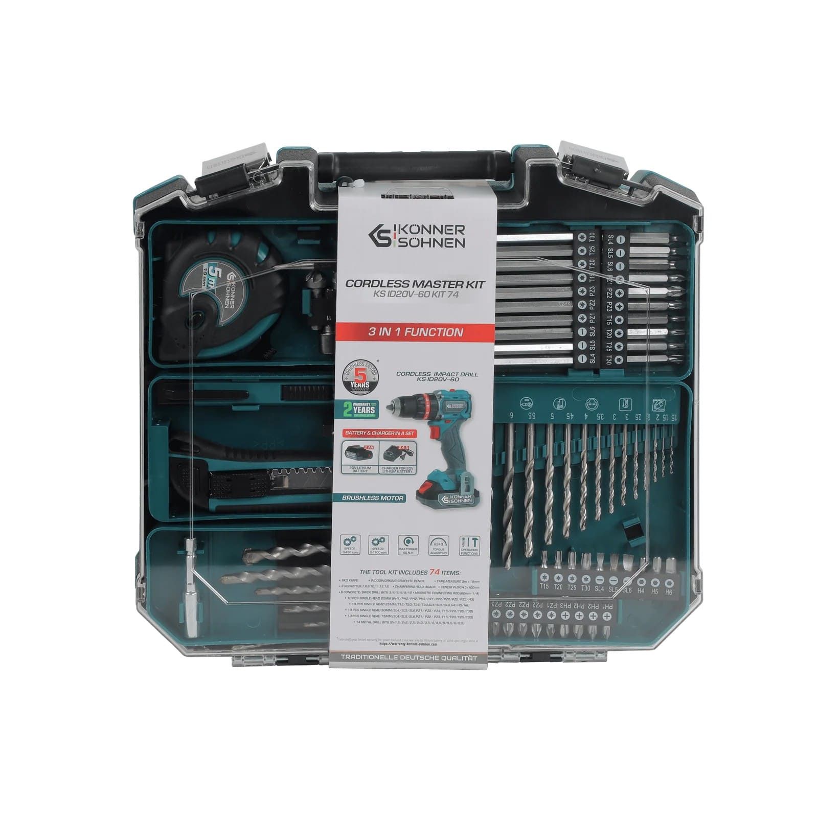 Шурупокрут-дриль ударний акумуляторний Konner&Sohnen KS ID20V-60 KIT 74 18В 1х2А·год 60Нм 0-450·0-1900об/хв LED-світло ЗП набір свердл і біт 74шт кейс 4.3кг