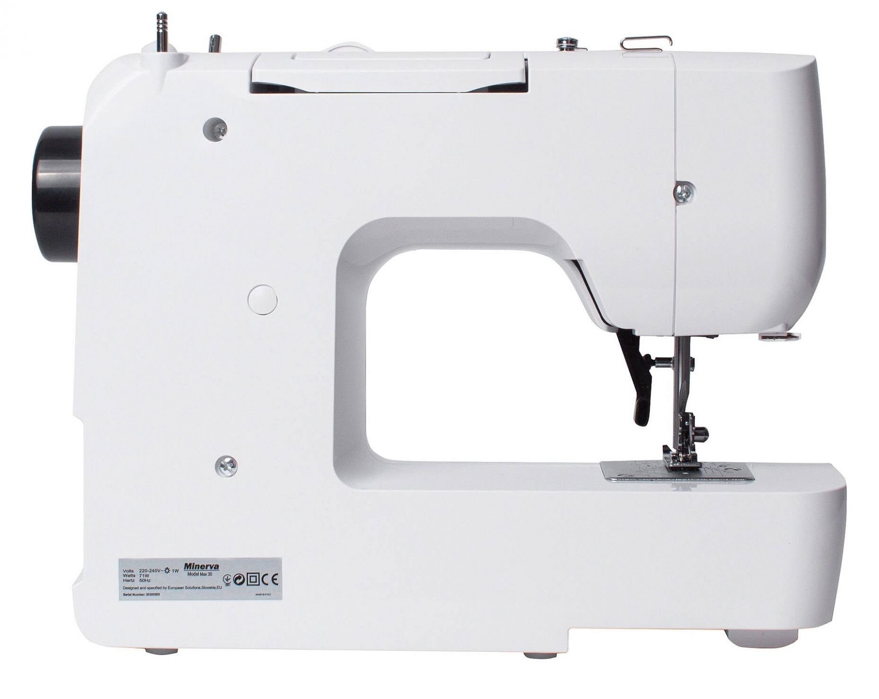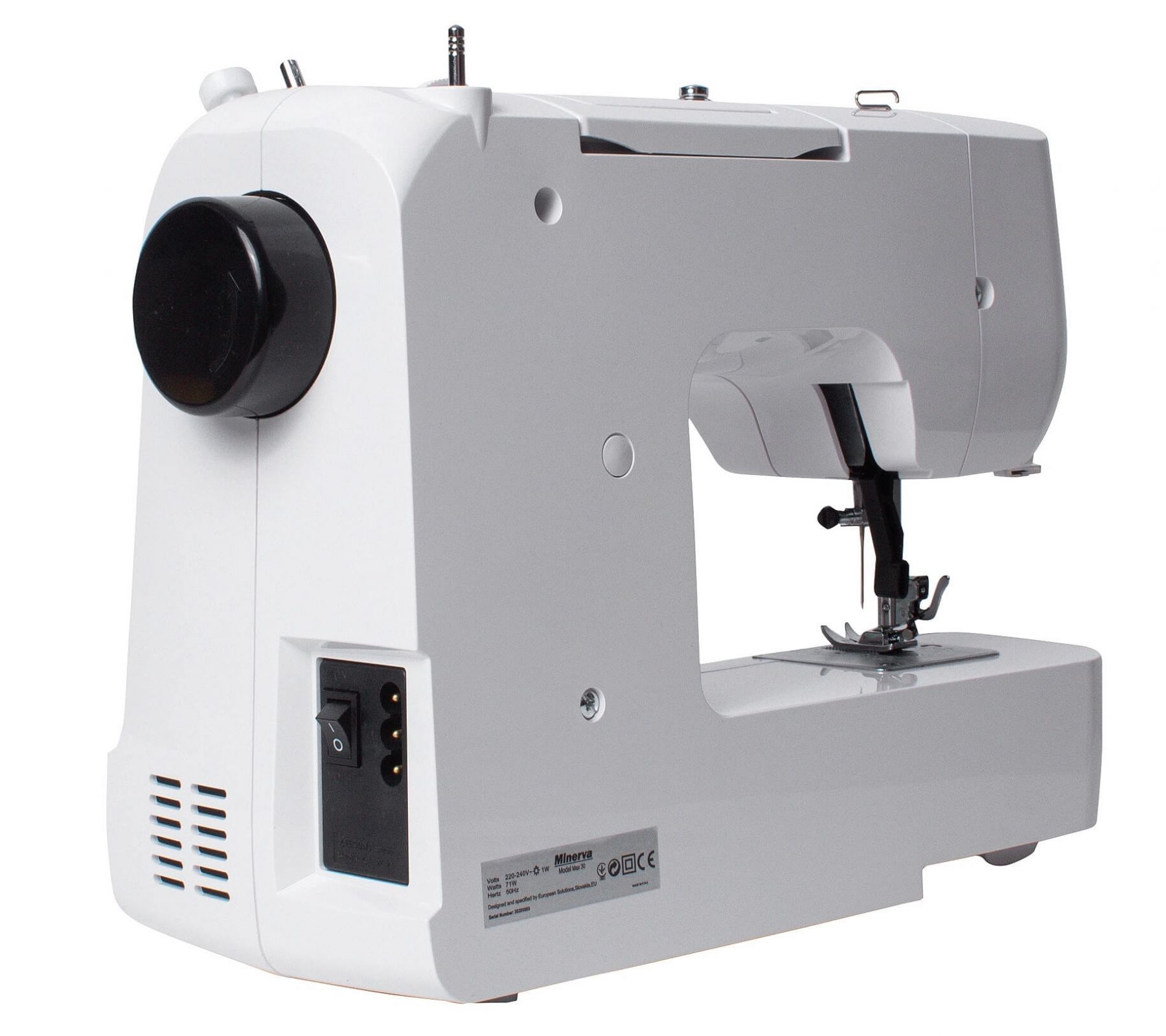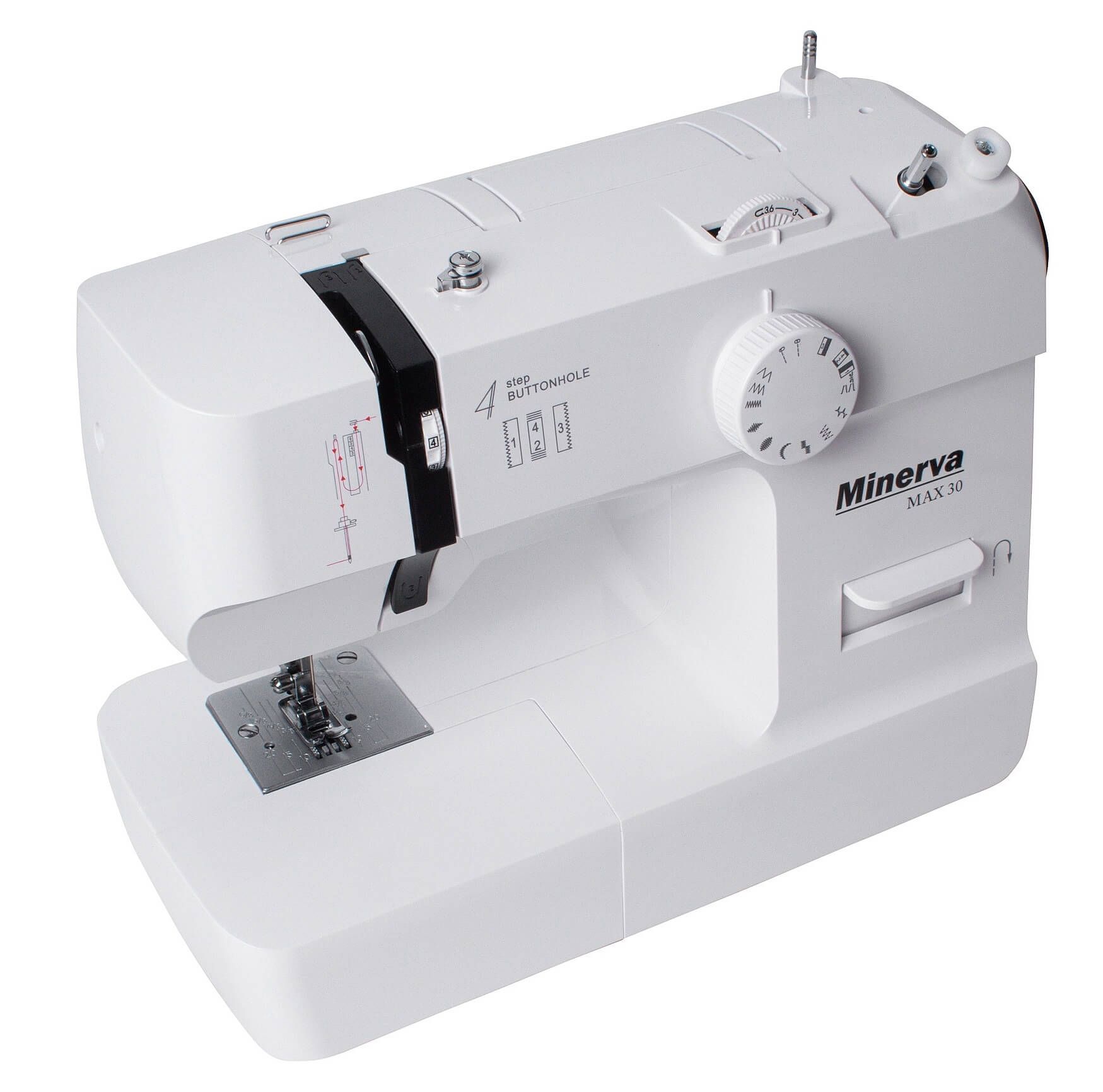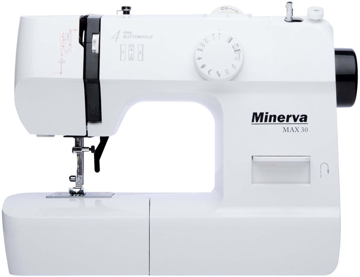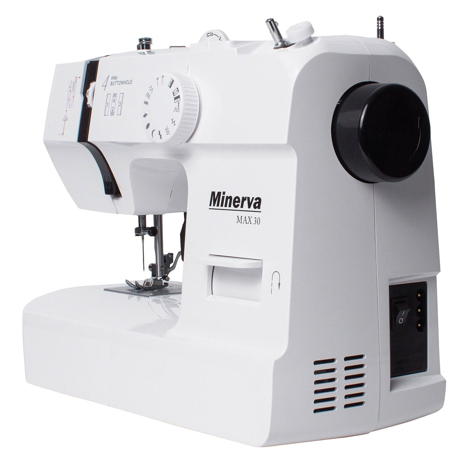 MINERVA Max 30 - нова практична модель швейної машинки компактної серії, оснащена класичним вертикальним човниковим пристроєм і яскравим світлодіодним підсвічуванням. Призначена для шиття і ремонту одягу. Виконує 13 видів строчок. Висока потужність, як для швейних машин компактної серії гарантує високу якість шиття на цупких тканинах.