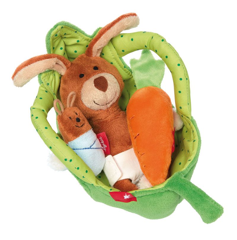 Незвичайна іграшка у вигляді люльки з маленьким кроленям. Іграшкова люлька нібито виготовлена з листя. Кроленя-немовля з підгузком на липучках. Кролик має власну морквину та невелику іграшку. Кролик розміром 22х11х22 см. Набір у красивій подарунковій коробці. Для дітей від одного року. Безліч сюжетів і захопливих ігор з такою іграшкою – гарантовані.